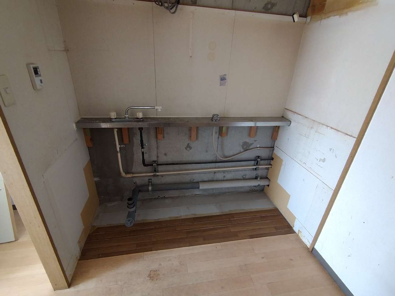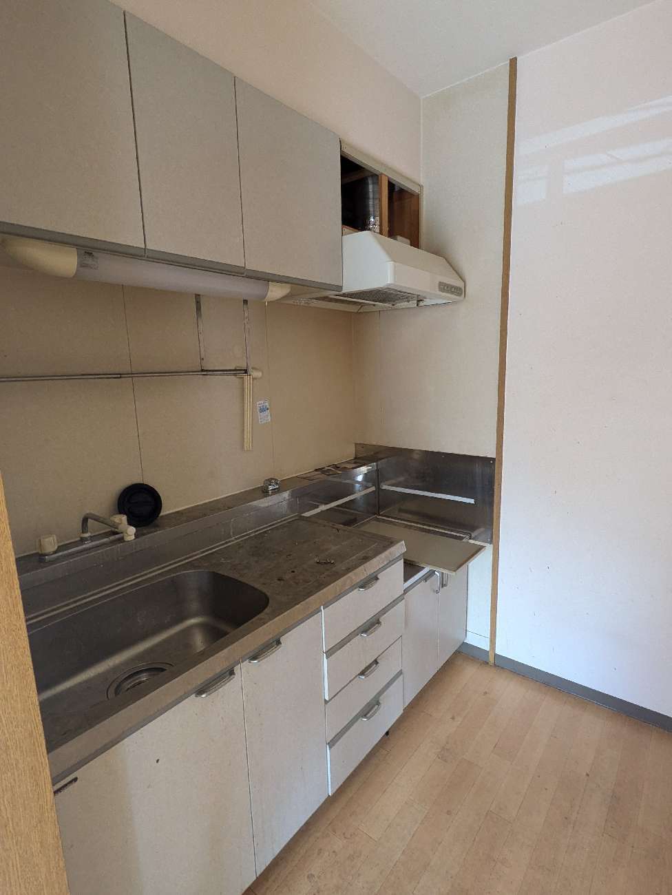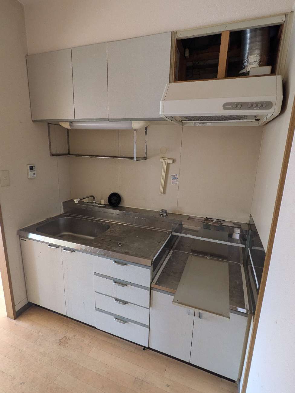 収納扉や作業場のステンレス部分には使用感があり、換気扇まわりも古さが強調されている印象…。