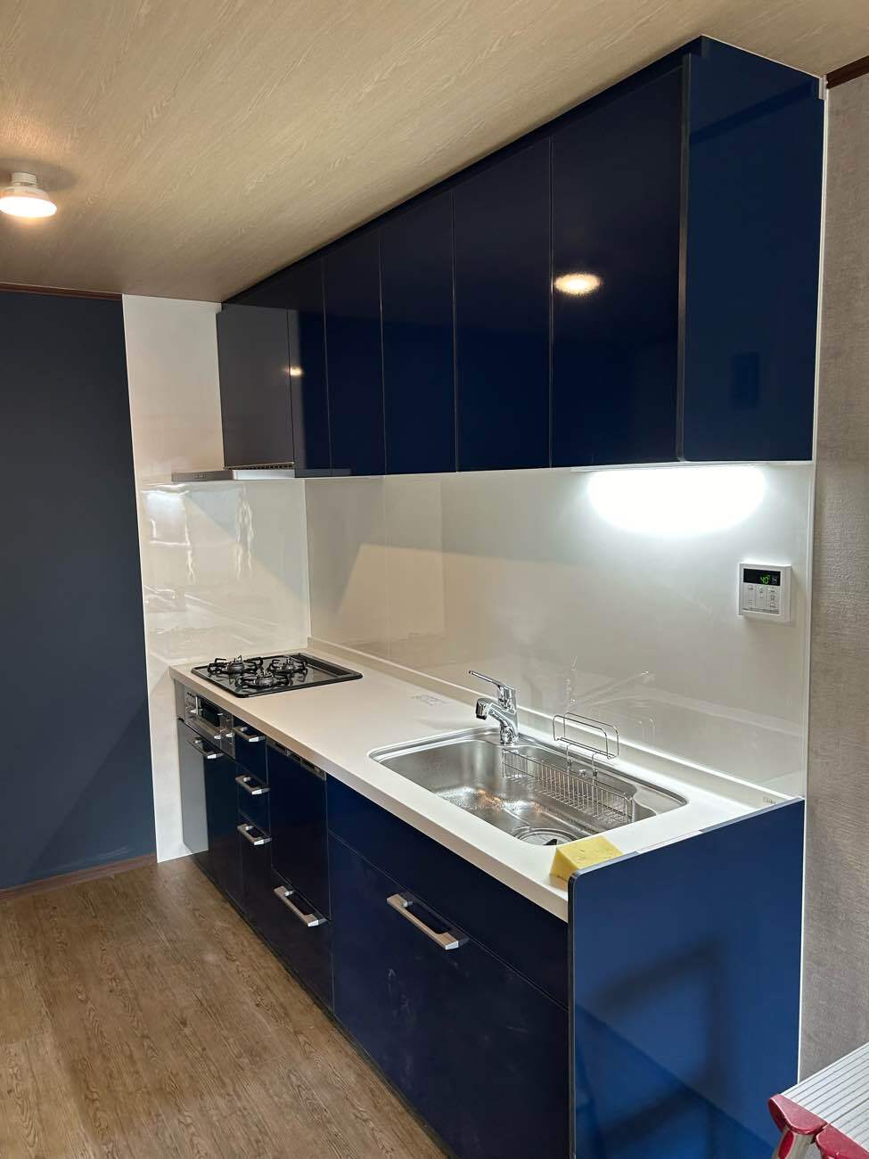 新しいキッチンは、深みのあるネイビーカラーの扉が特徴。白い天板と組み合わせることで、明るさと落ち着きを両立しています🌞壁もタイルからお手入れしやすいパネルに変更したので、油汚れもサッと拭くだけ!毎日のお掃除がぐっとラクになります✨