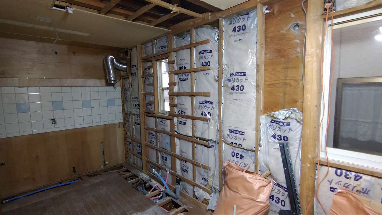 今回の工事でも、既存のキッチンを解体すると、壁の中の断熱材や柱、床下を通る配管がしっかり見える状態になりました。普段はきれいな扉や天板に隠れている部分ですが、実はここがとても大切なんです。