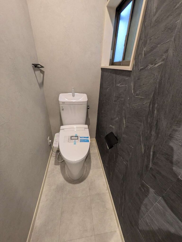 この一面があることで、空間に奥行きと引き締まりが生まれ、一気に「デザインされたトイレ」に変わります✨ただ明るいだけでは終わらせない設計です。