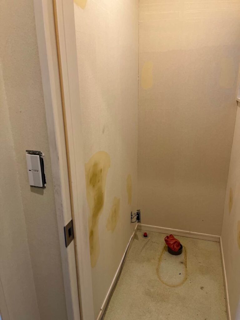 元あった壁紙をはがすと壁の一部には、下地補修の跡や変色がはっきり残っている状態。