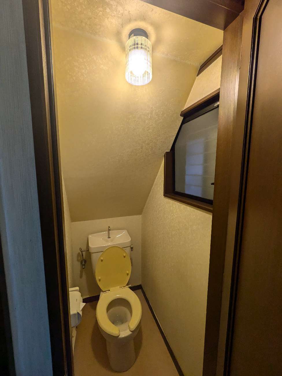 長年使われてきたことが感じられるシンプルなトイレでした。便座は昔ながらのタイプで、設備としては必要最低限。空間自体はコンパクトで、階段下のスペースを活用した形になっているため天井が斜めになっており、どこか閉塞感のある印象です。